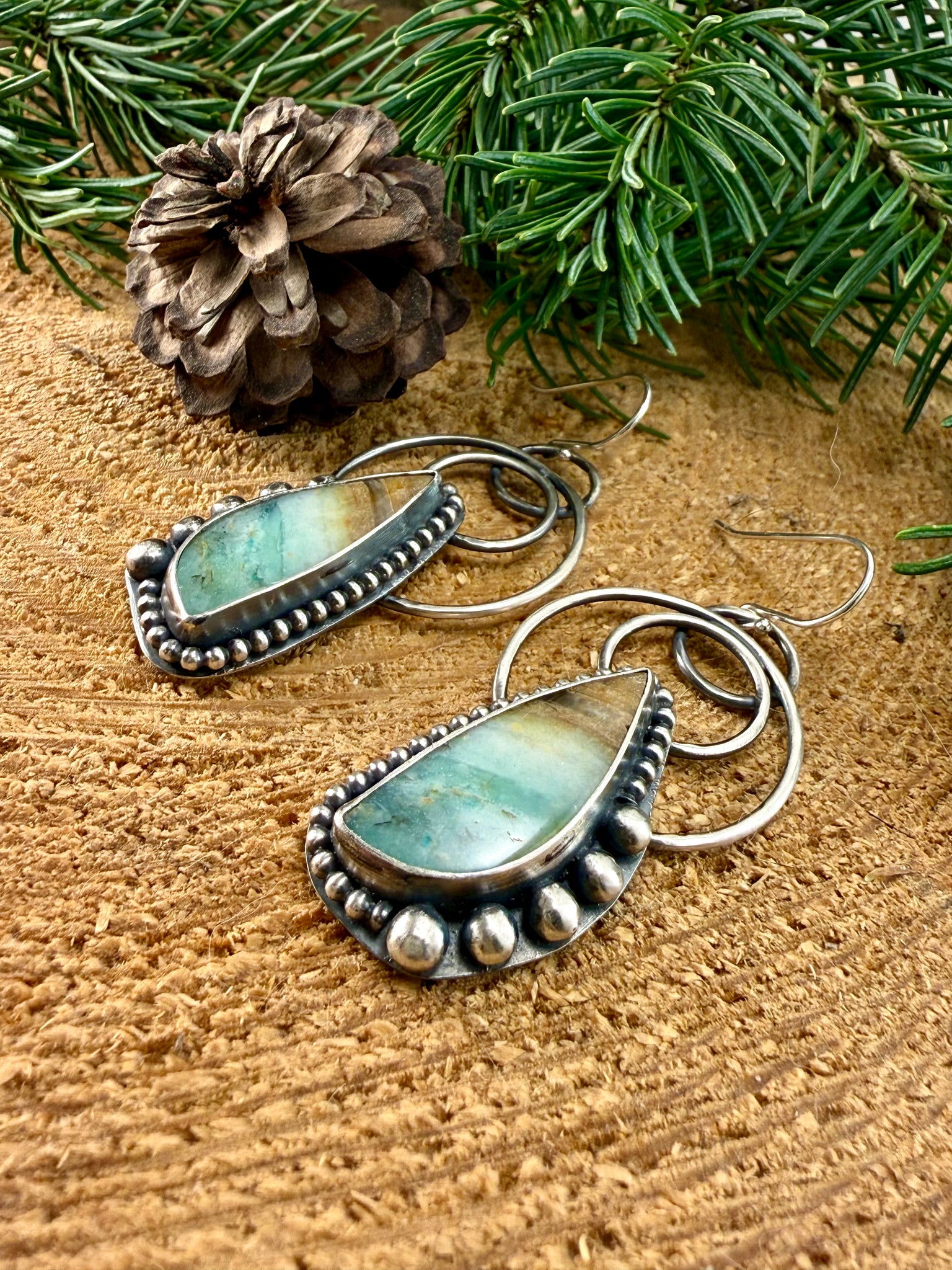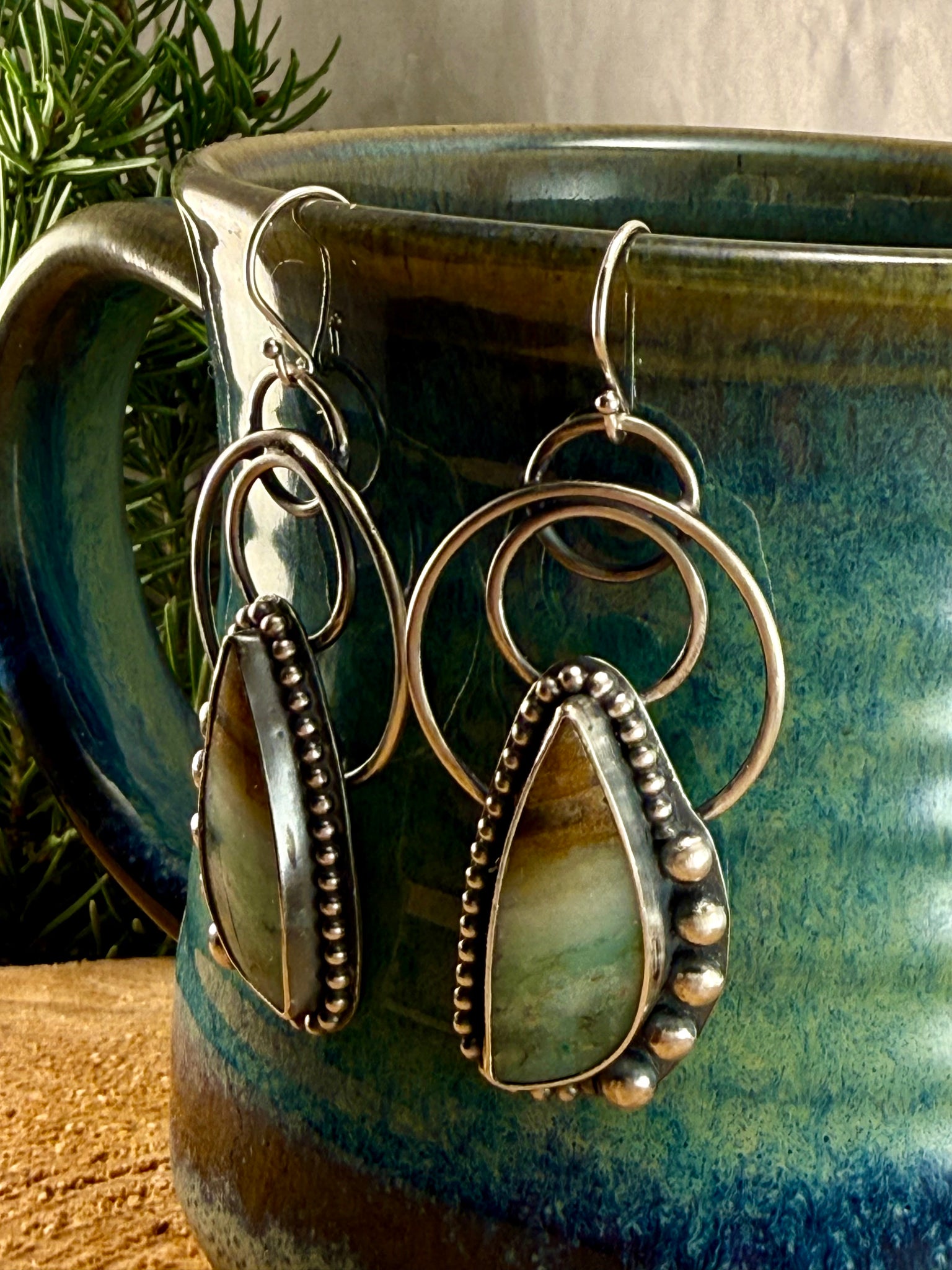 Hand forged hammered sterling silver round double hoop earrings adorned with blue opalized petrified wood gemstones in hand forged settings, and set on sterling silver ear wires. Earrings measure approximately 64mm long, from the top of the earring hook to the bottom of the silver hoop, and approximately 27mm wide.