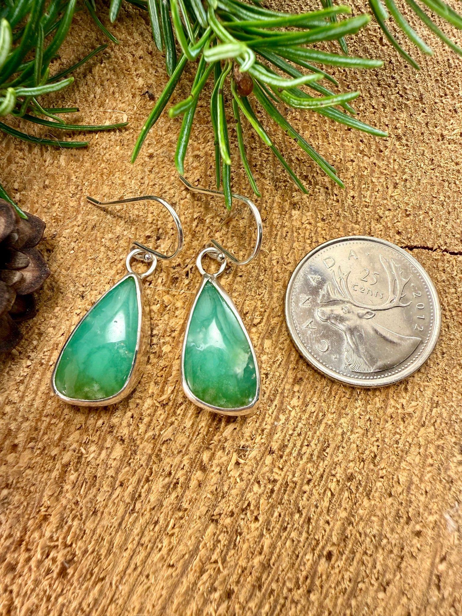 Chrysoprase gemstones set in sterling silver settings, and set on sterling silver ear wires. Earrings measure approximately 38mm long, from the top of the earring hook to the bottom of the gemstone drop, and approximately 11mm wide at the widest point of the drop.