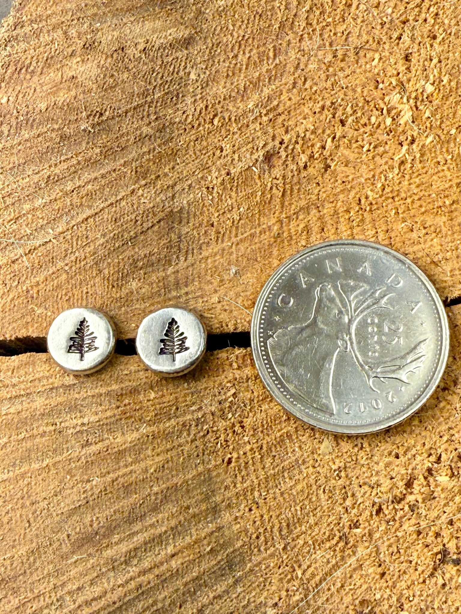 Hand forged sterling silver pebbles with hand stamped trees, set on sterling silver ear posts with sterling silver rhodium plated ear nuts. Earrings measure approximately 6mm round, with 9mm long ear posts.