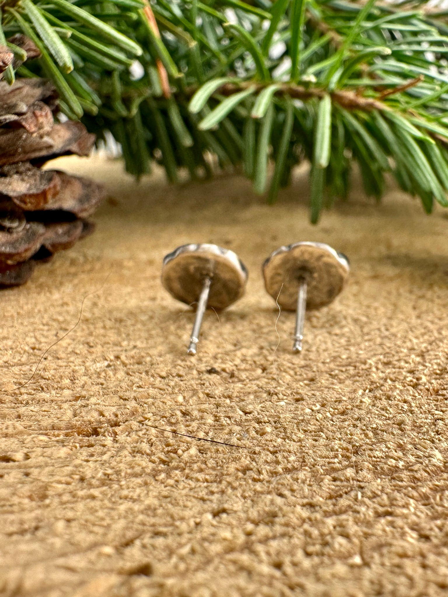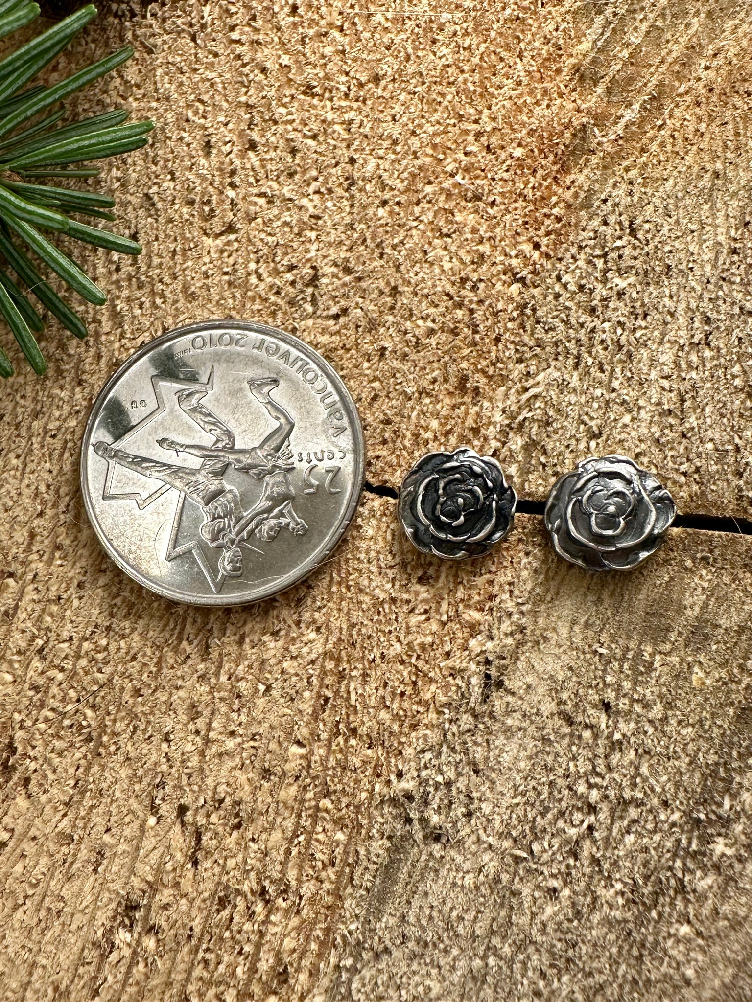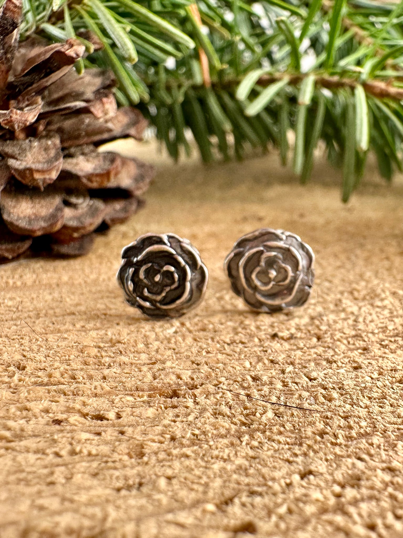 Hand cast fine silver rose rounds set on sterling silver ear posts with sterling silver rhodium plated ear nuts. Earrings measure approximately 10mm round, with 9mm long ear posts.