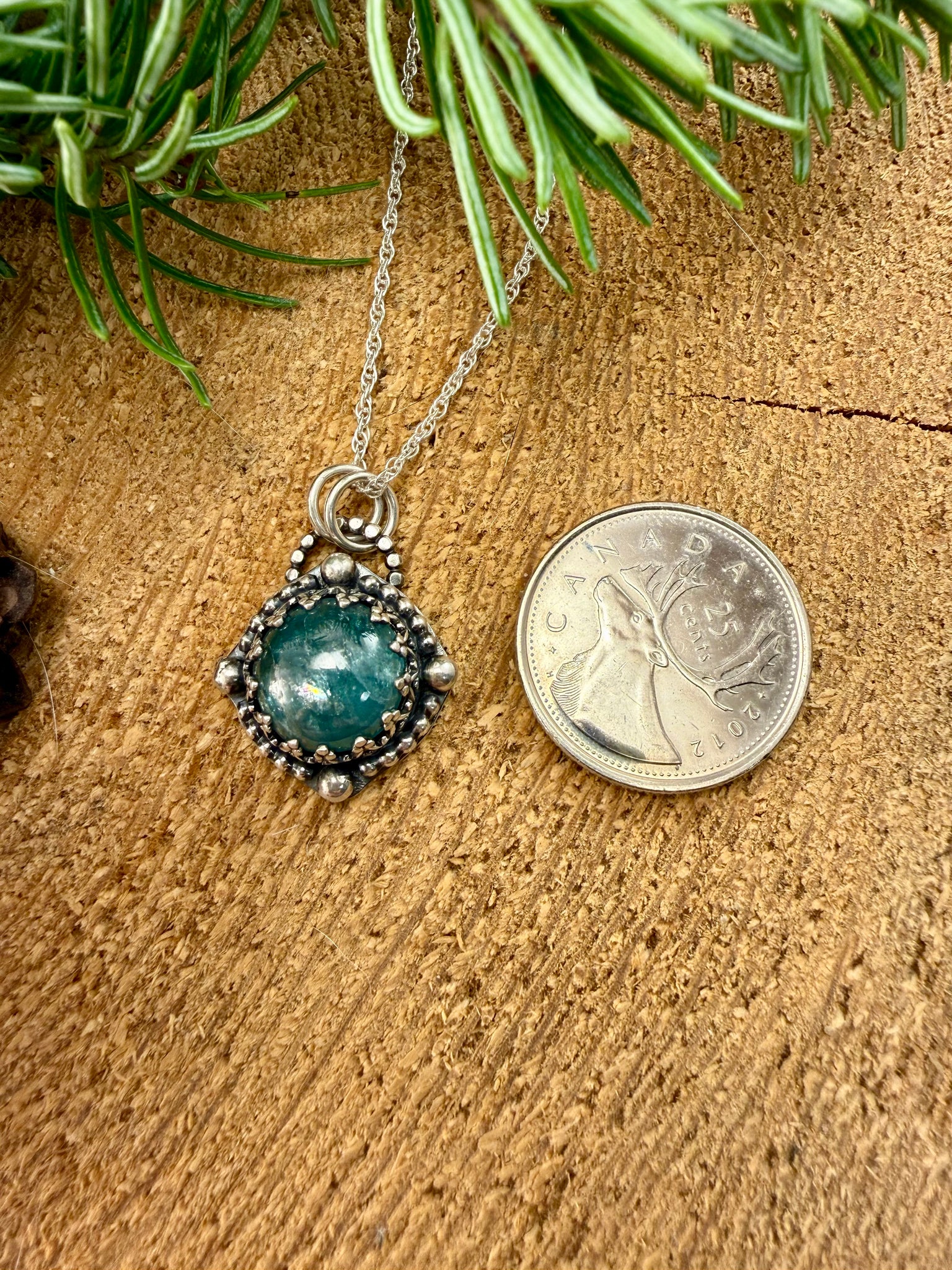 Hand forged sterling silver setting with sterling silver beads and accents featuring a blue kyanite gemstone. Pendant measures approximately 24mm, from top of the jump ring connecting the pendant to the chain to the bottom of the pendant, and approximately 16mm wide. This piece is set on a sterling silver chain which is available between 16”-24”, please specify chosen length from the following listing.
