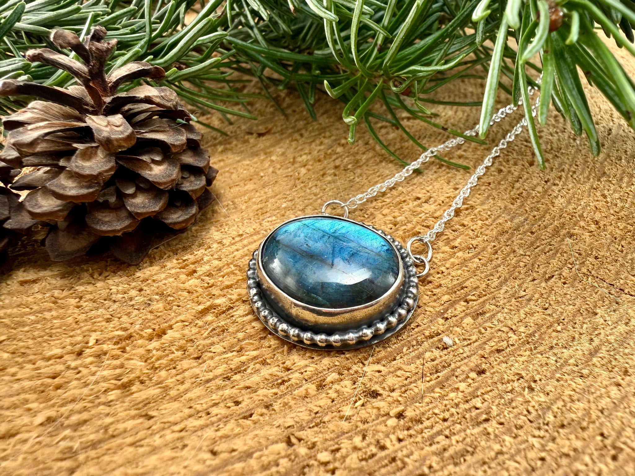 Hand forged sterling silver setting featuring a labradorite gemstone. Pendant measures approximately 21mm, from top of the jump ring connecting the pendant to the chain to the bottom of the pendant, and approximately 21mm wide. This pendant is set on a sterling silver chain 16” long, if you require the chain on this piece to be lengthened or shortened please message us after purchase so we can accommodate.