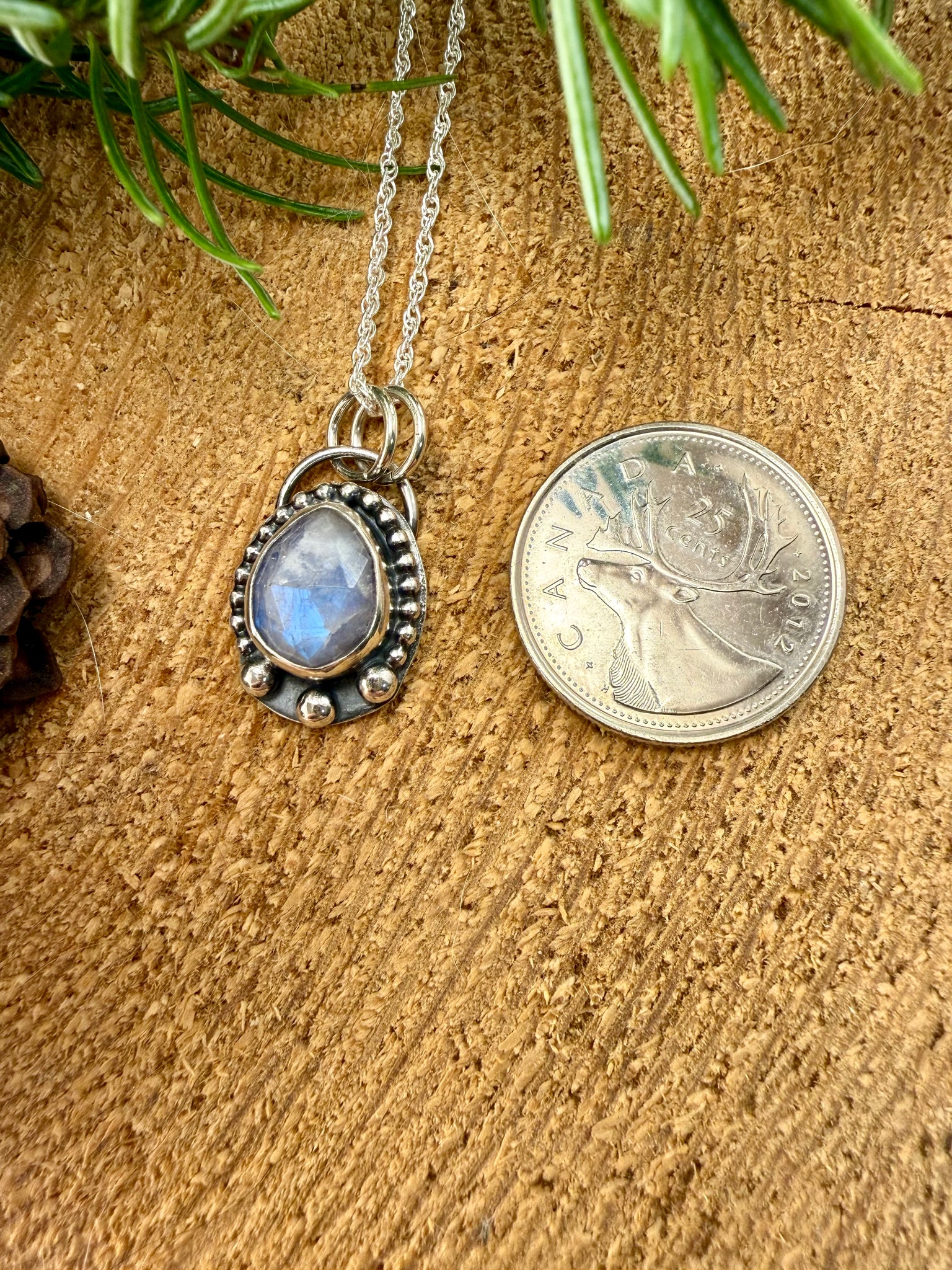 Hand forged sterling silver setting with sterling silver beads and accents featuring a rainbow moonstone gemstone. Pendant measures approximately 22mm, from top of the jump ring connecting the pendant to the chain to the bottom of the pendant, and approximately 12mm wide. This piece is set on a sterling silver chain which is available between 16”-24”, please specify chosen length from the following listing.