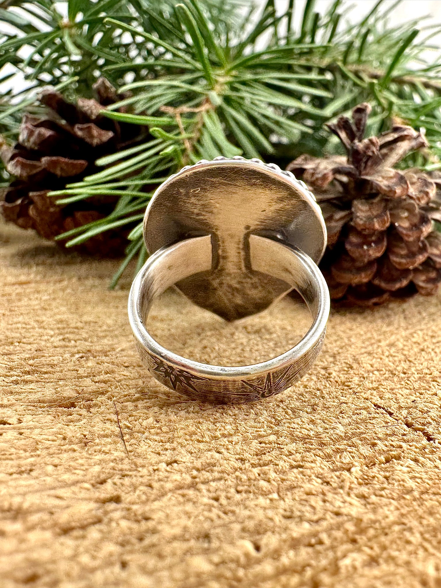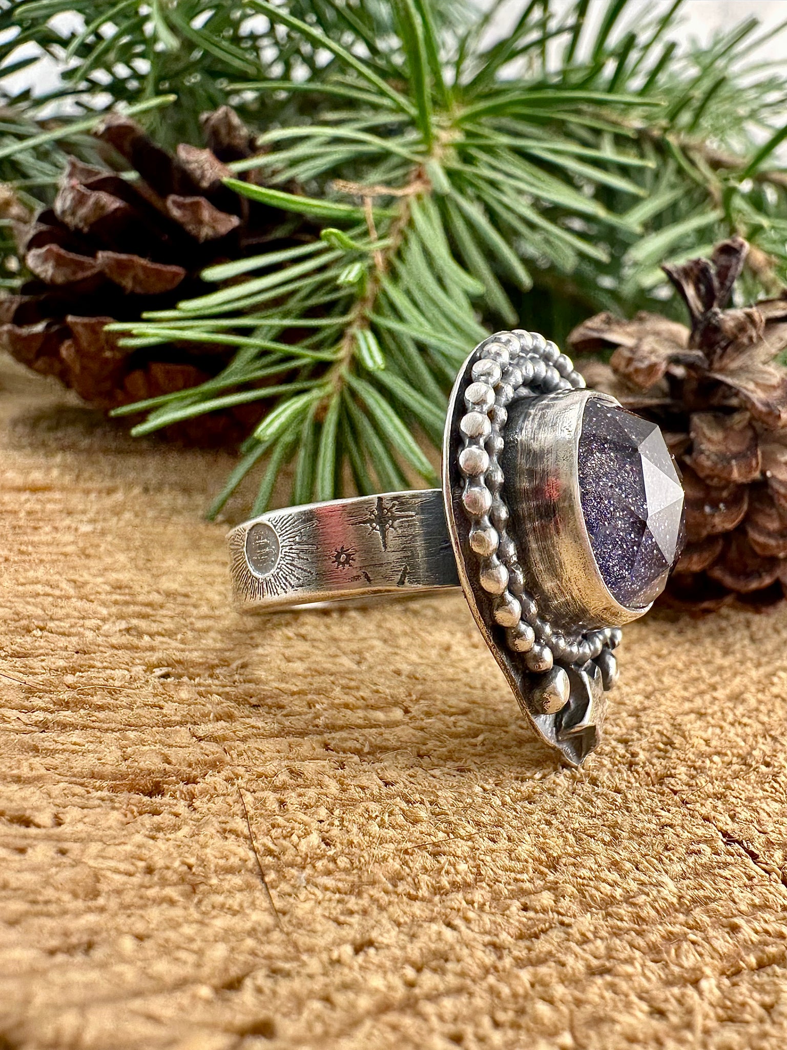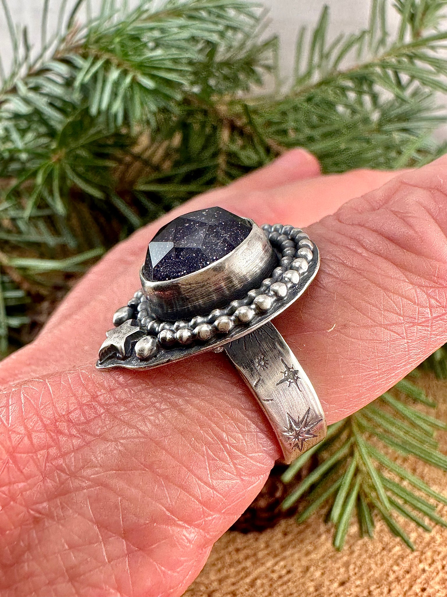 Round Blue Sun Sitara gemstone set in sterling silver with sterling silver bead accents and stars and set on a solid sterling silver band.