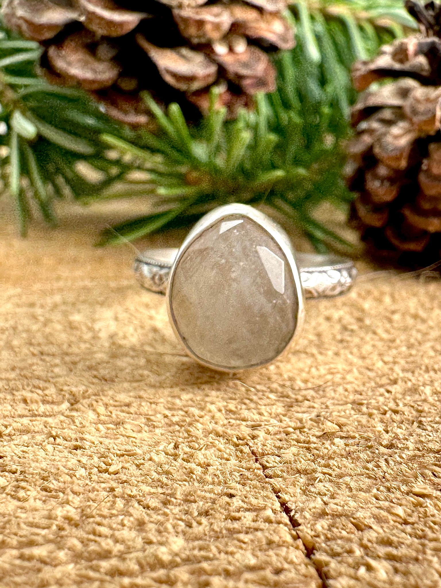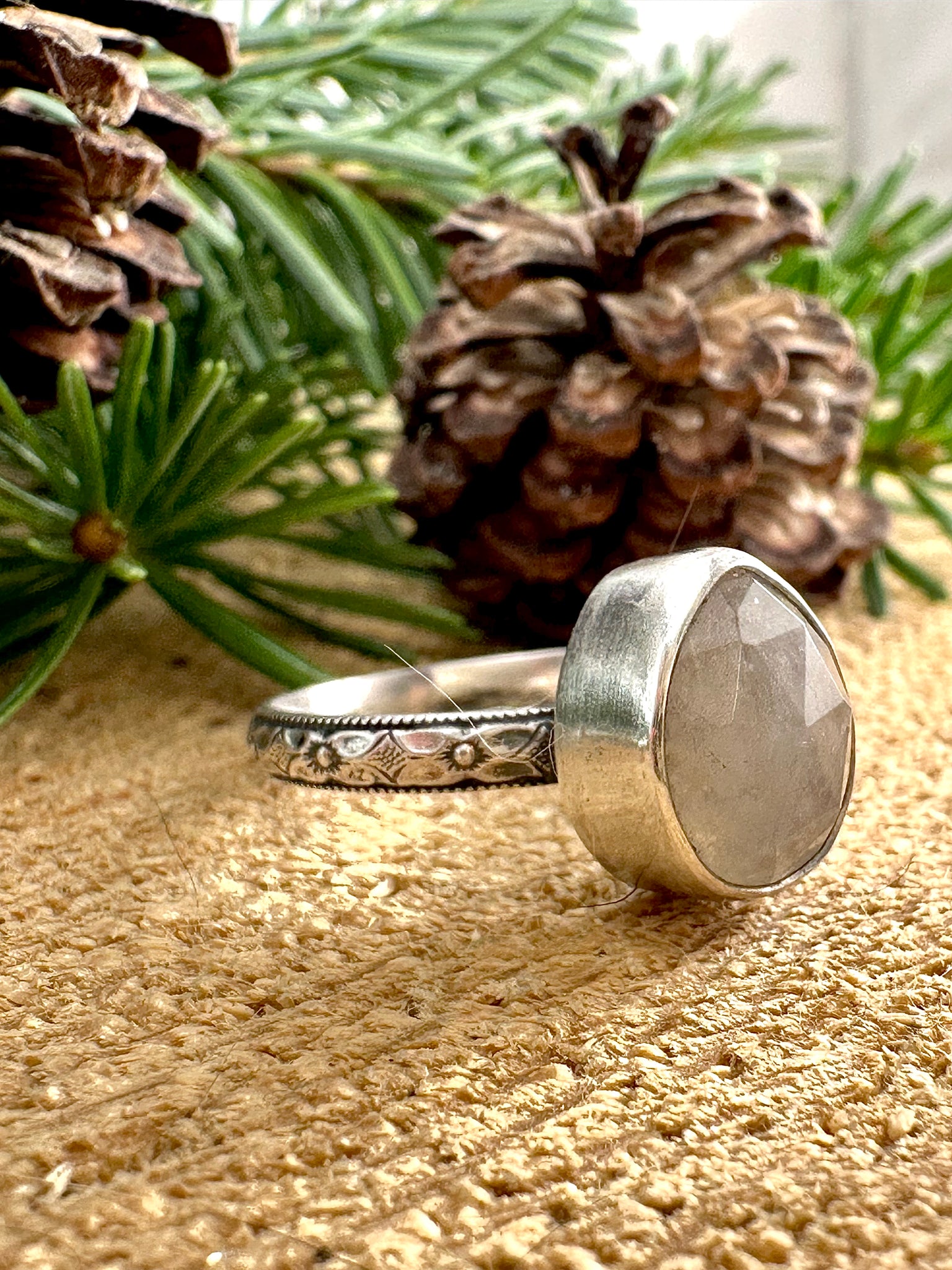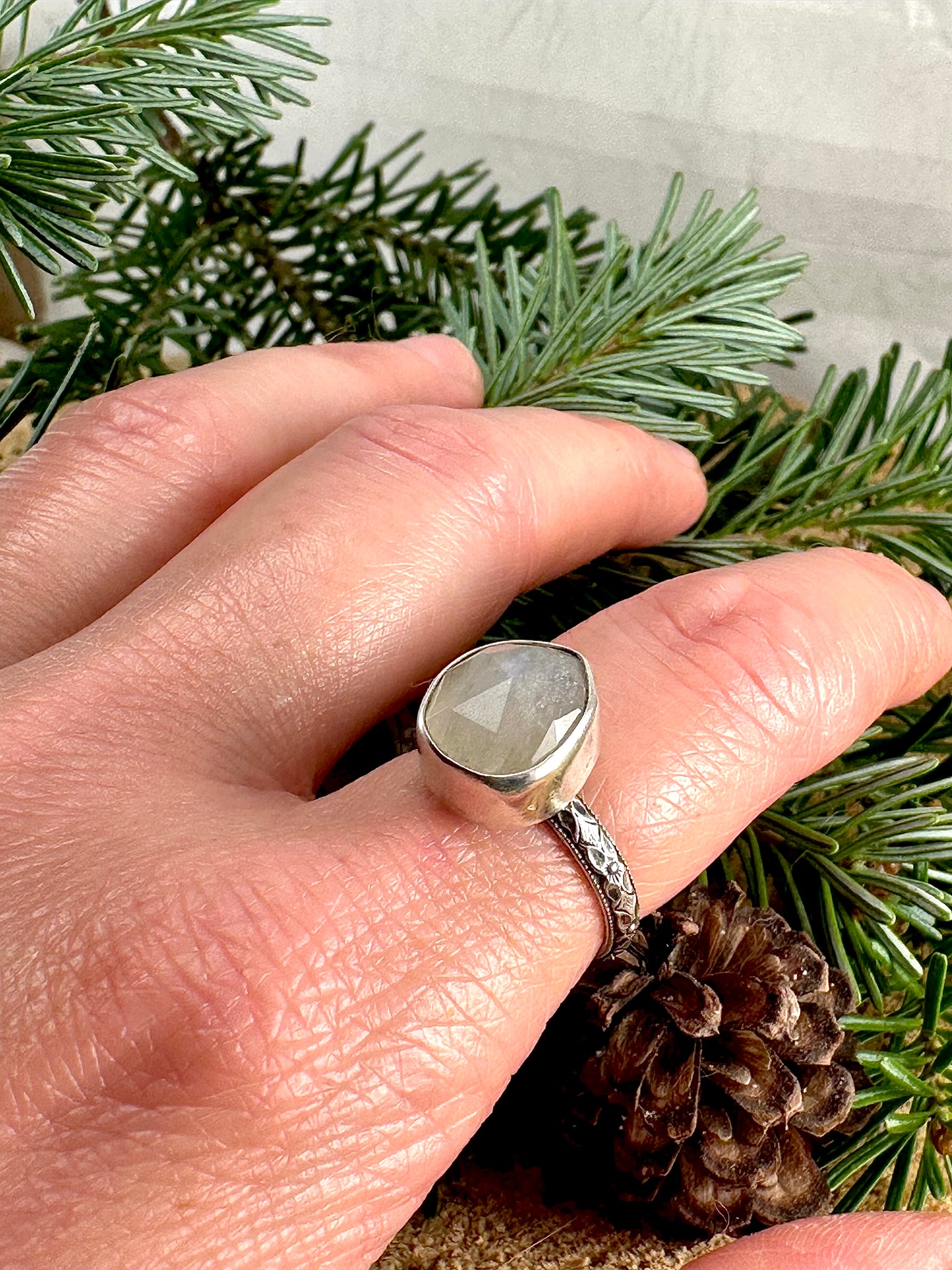 Rainbow Moonstone gemstone set in sterling silver and set on a solid sterling silver band.