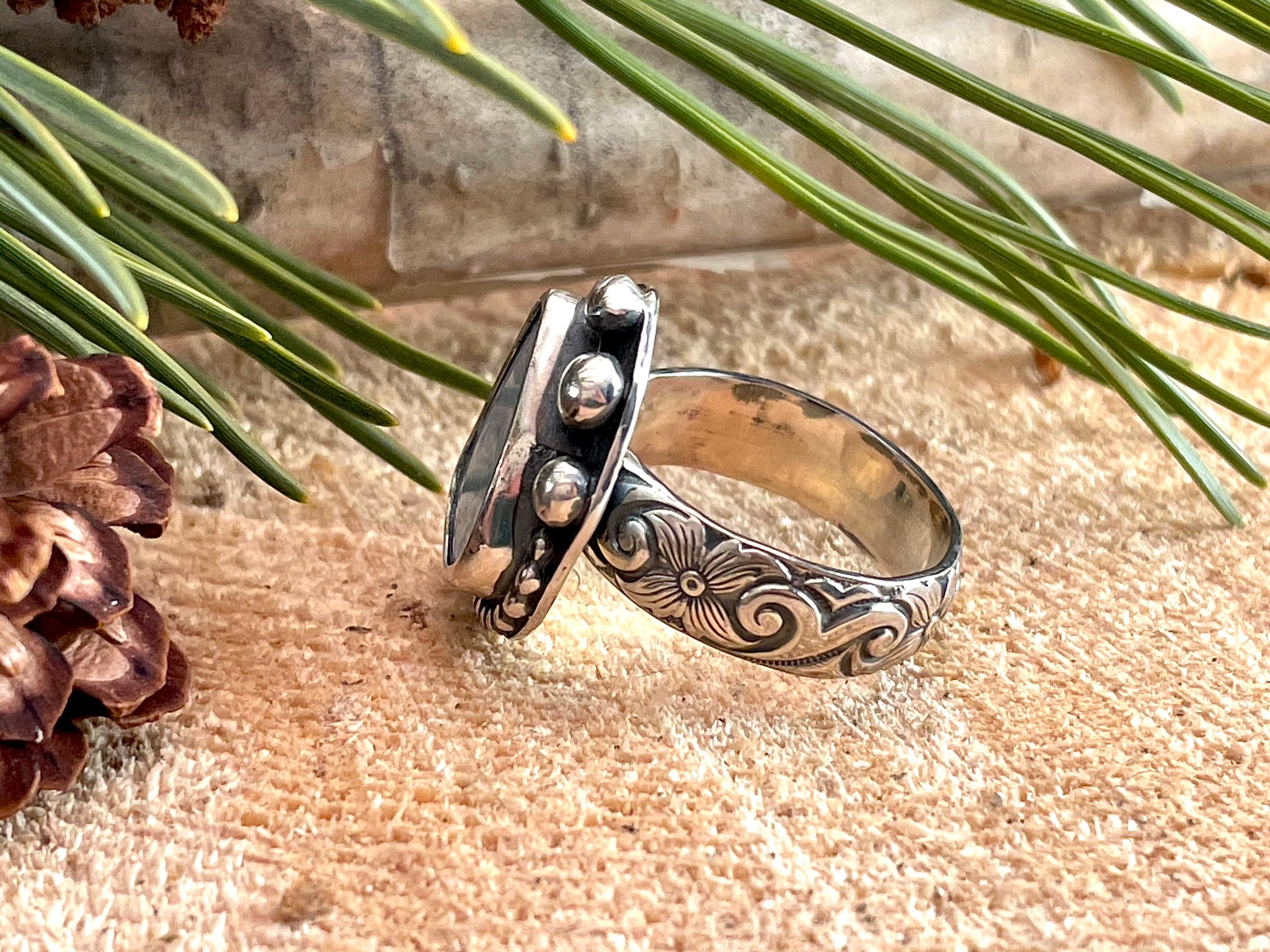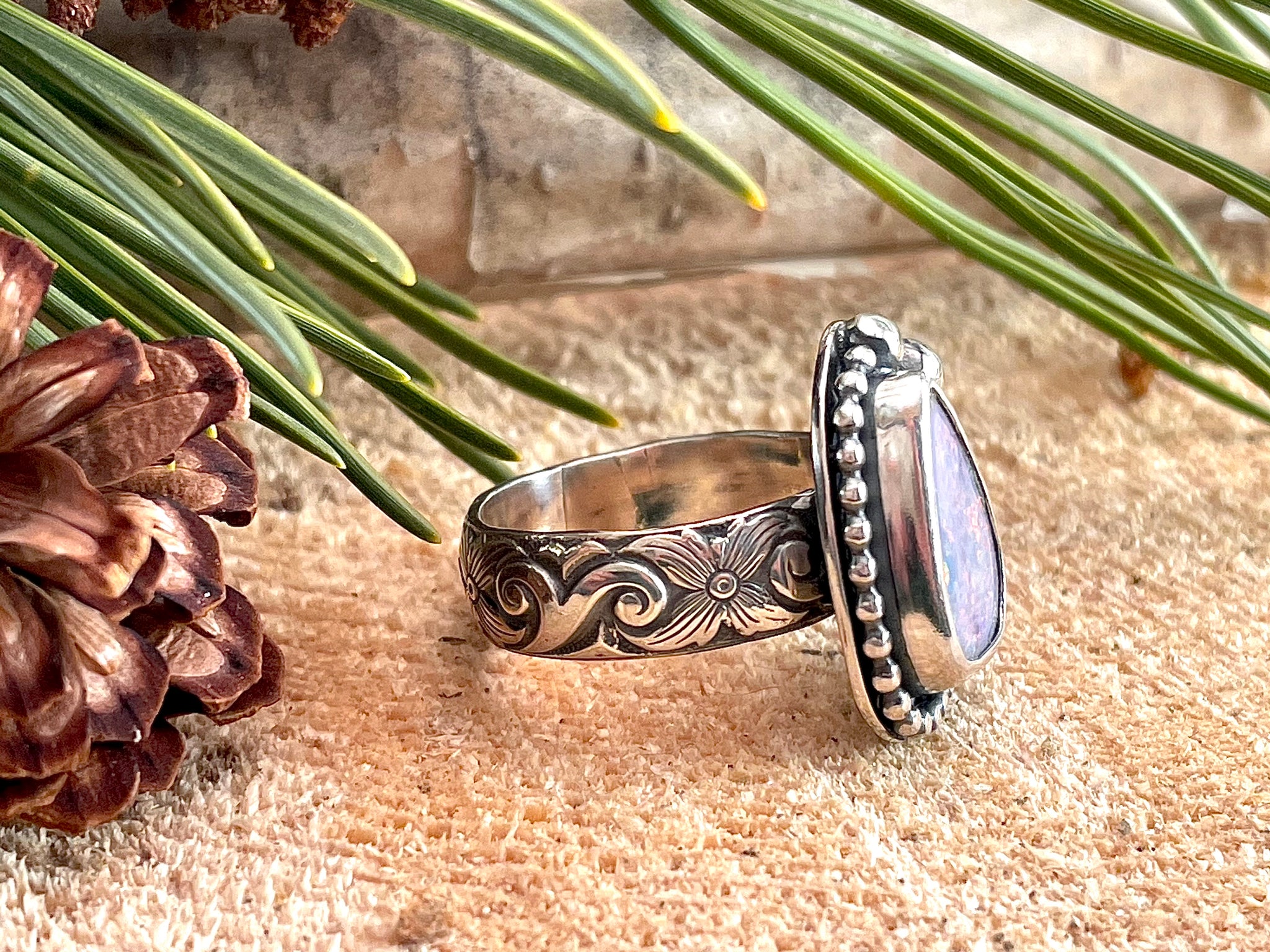 Australian Opal triplet gemstone set in a fine and sterling silver setting and accented with sterling silver balls and beading, set on a solid sterling silver ring band. The face of this ring measures approximately 19mmx15mm.