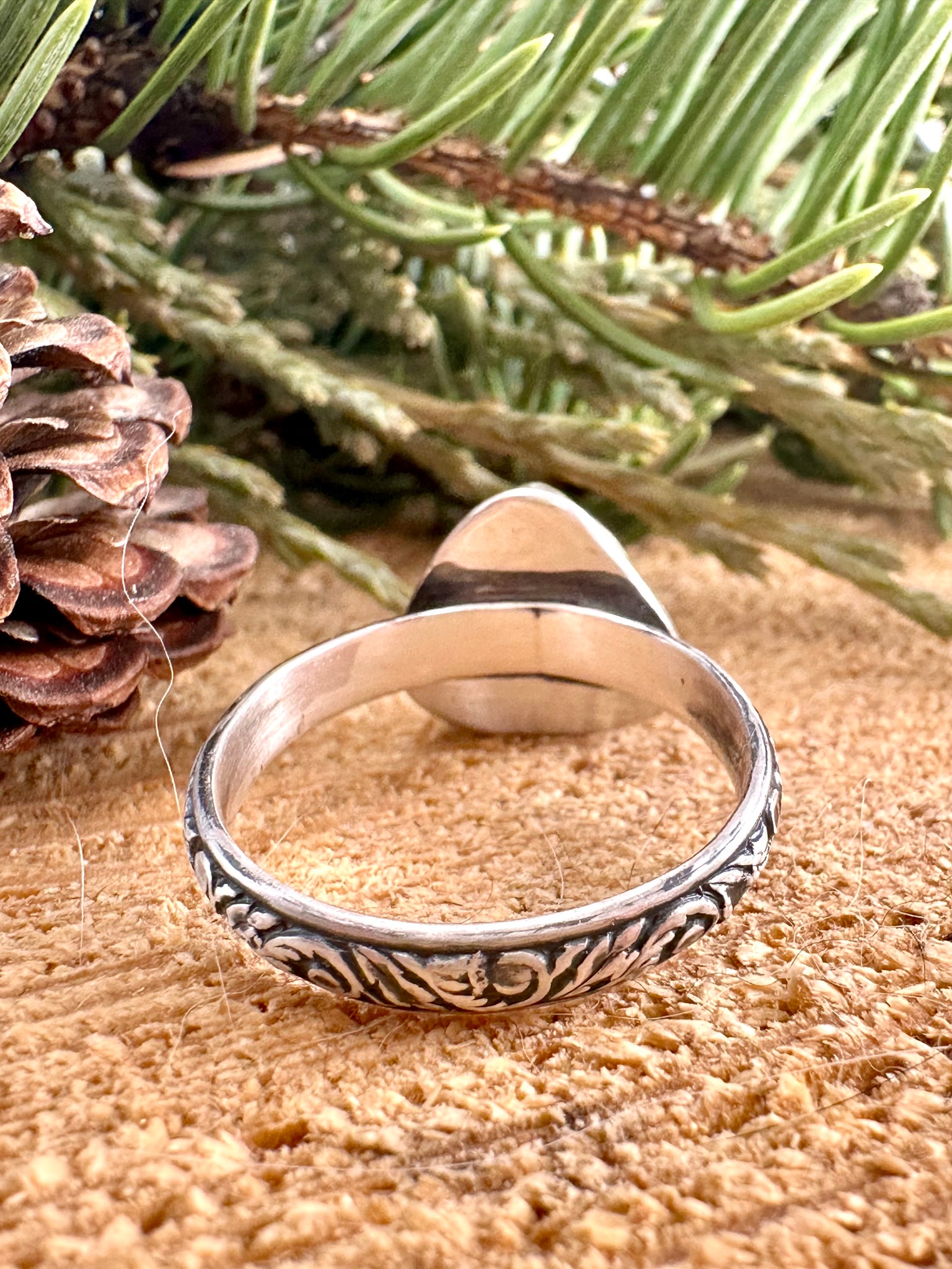 Trillium labradorite gemstone set in sterling silver and set on a solid sterling silver band.