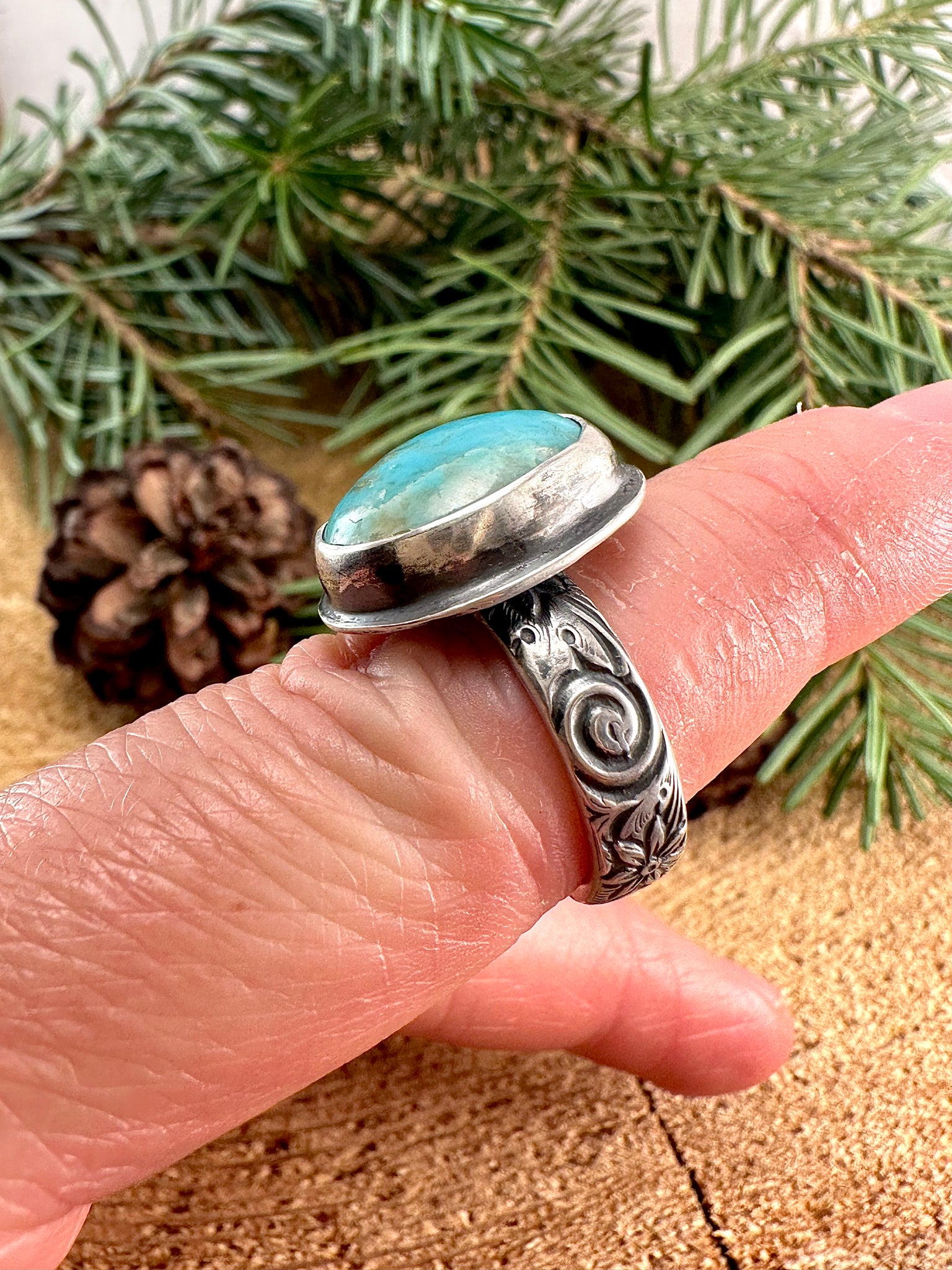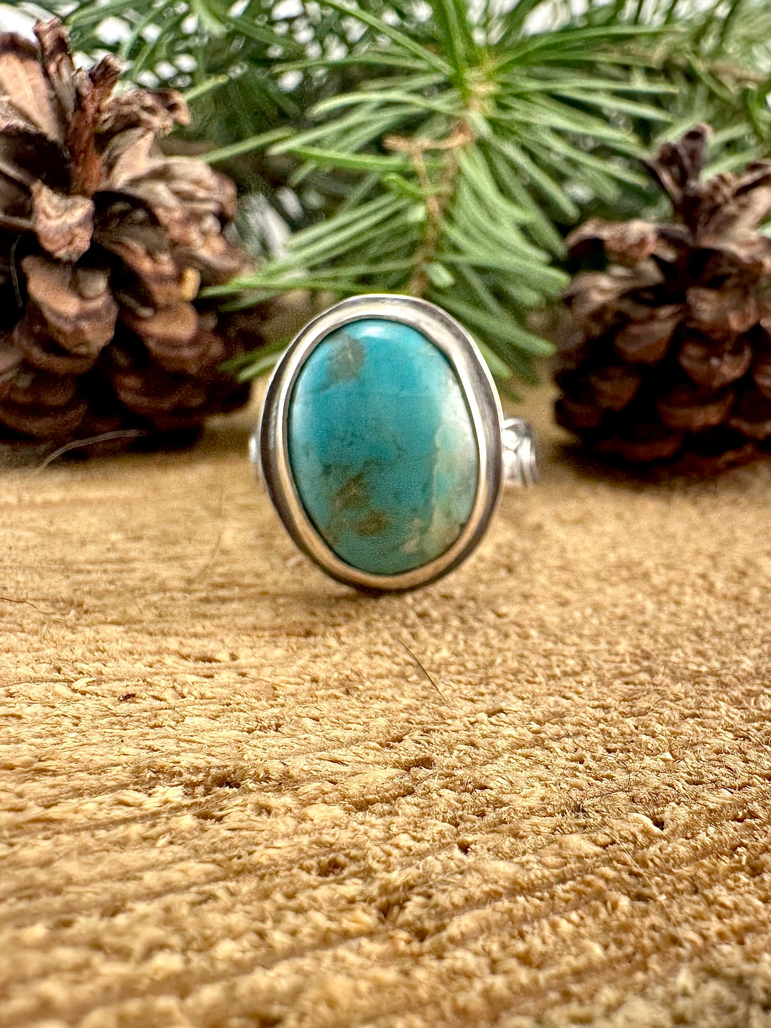 Kingman Turquoise gemstone set in sterling silver and set on a solid sterling silver band.
