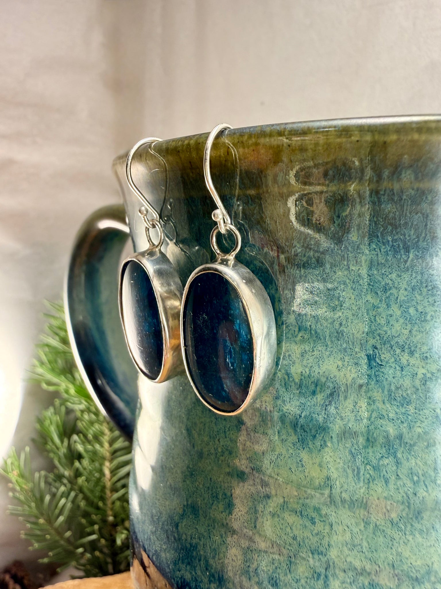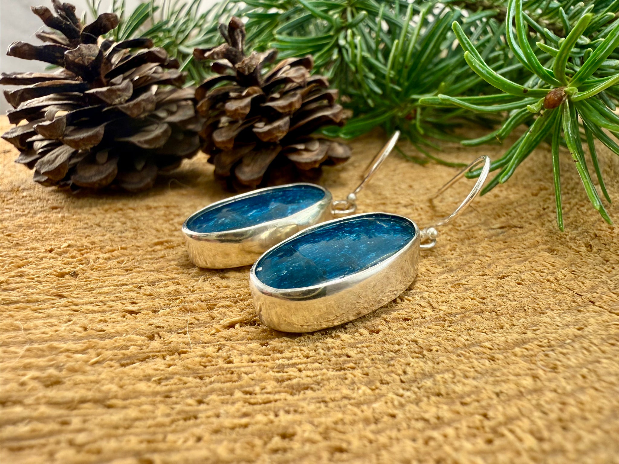 Neon Apatite gemstones set in sterling silver settings, and set on sterling silver ear wires. Earrings measure approximately 38mm long, from the top of the earring hook to the bottom of the gemstone drop, and approximately 14mm wide at the widest point of the drop.