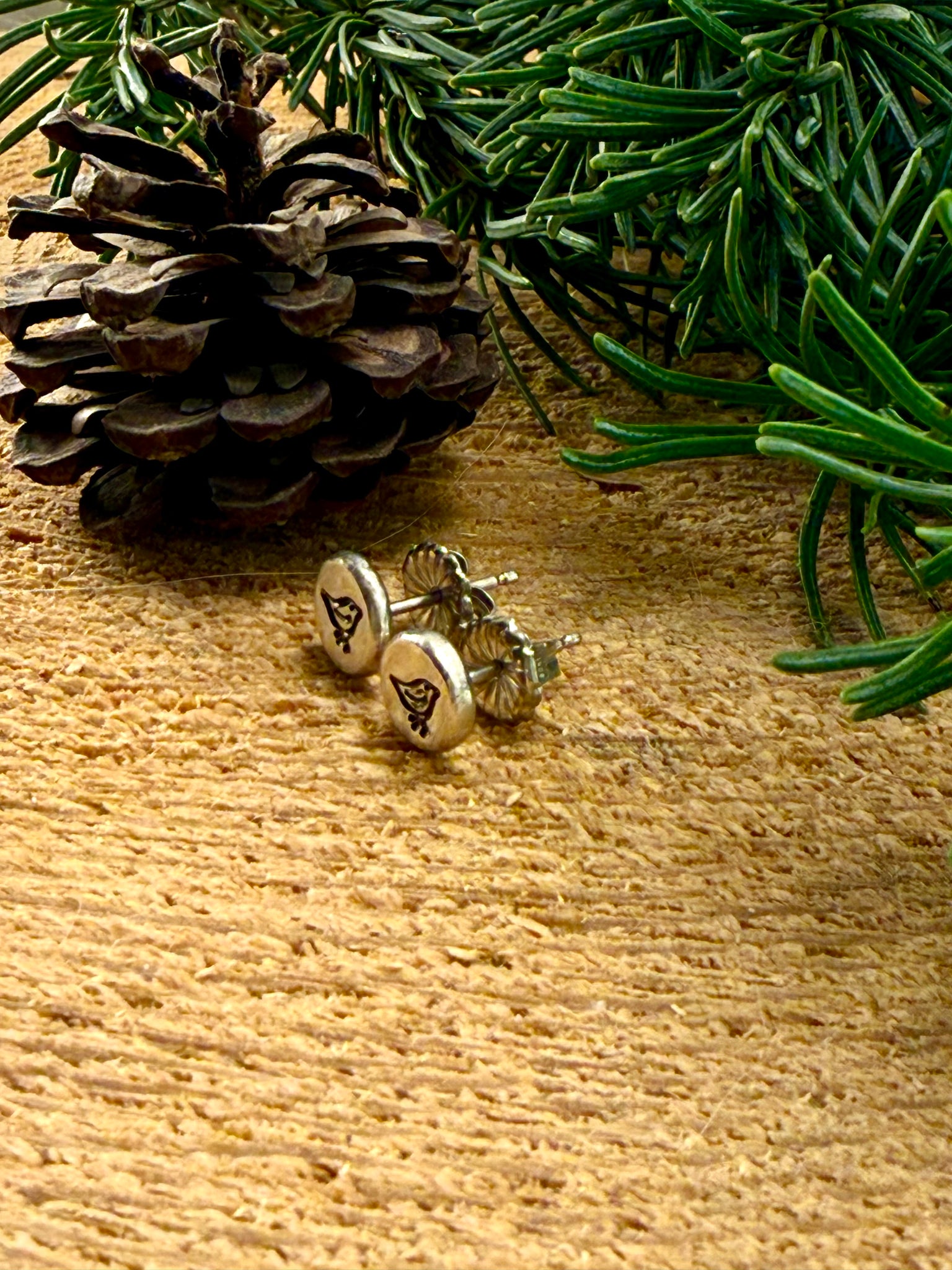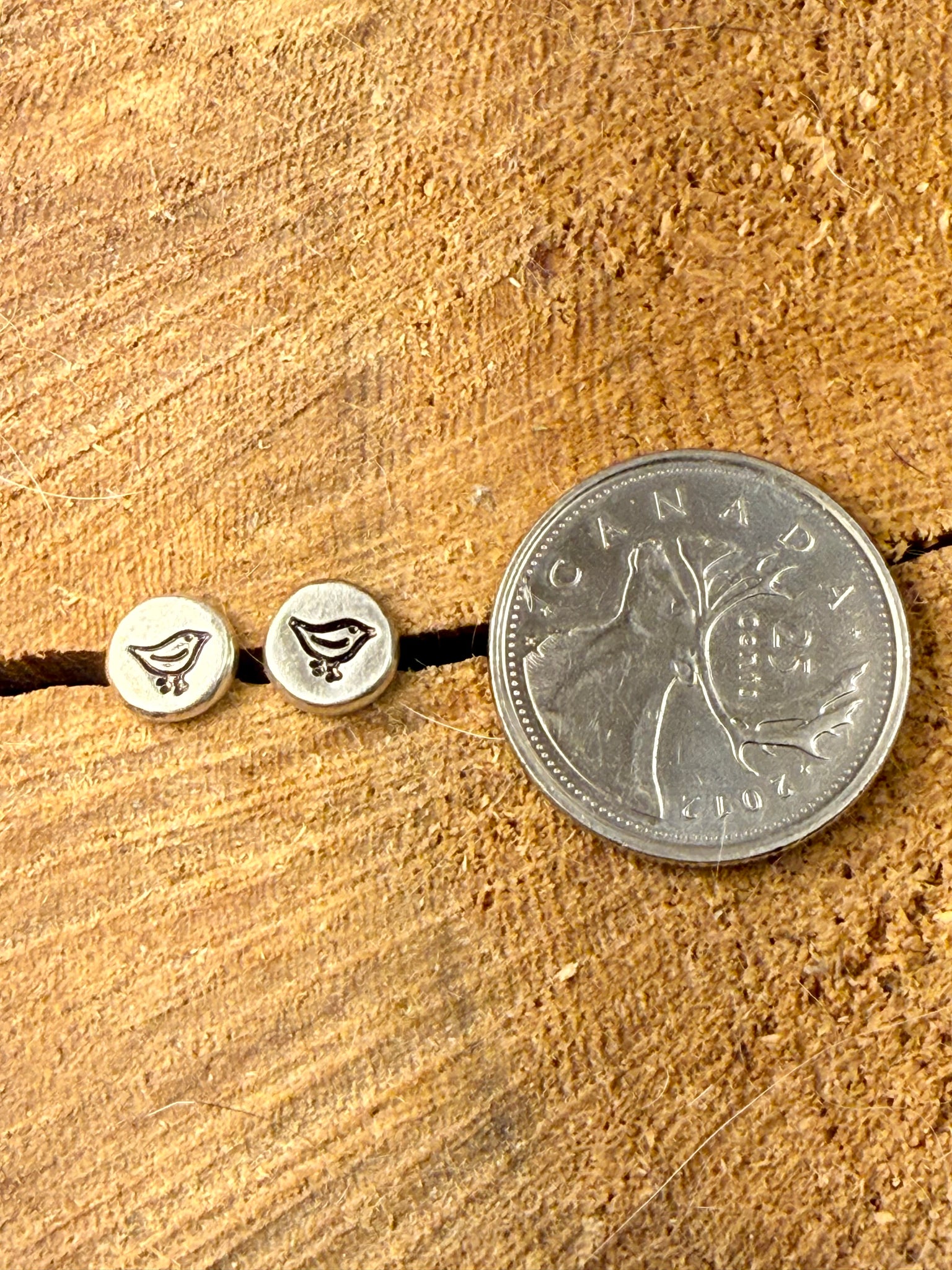 Hand forged sterling silver pebbles with hand stamped birds, set on sterling silver ear posts with sterling silver rhodium plated ear nuts. Earrings measure approximately 6mm round, with 9mm long ear posts.